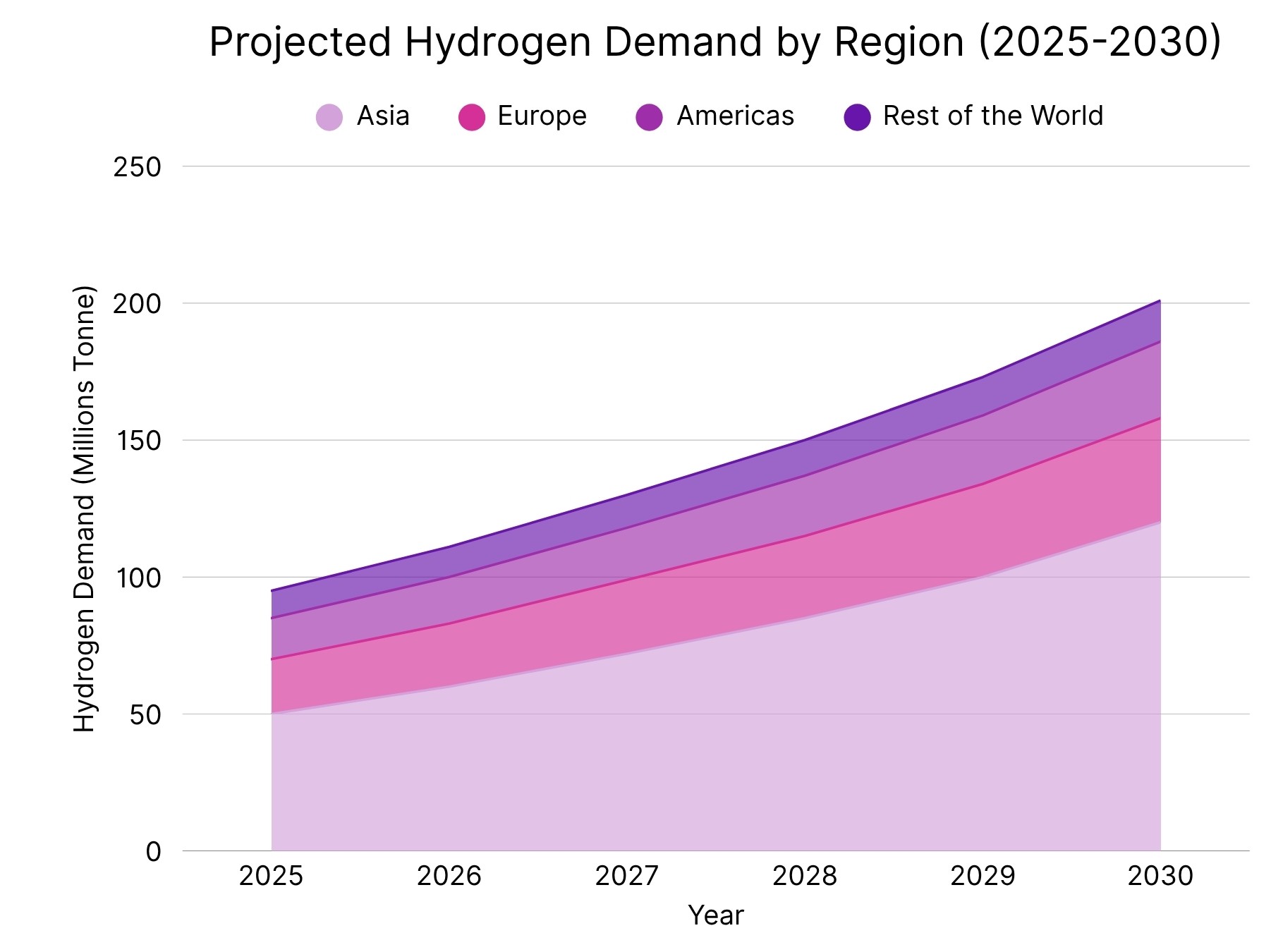 Global hydrogen demand is projected to grow from 95 million tonnes (2023) to over 140 million tonnes by 2030, with Asia accounting for more than 50% of demand growth.